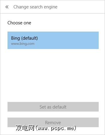 上面的屏幕快照最初是这样的设置:Bing作为默认设置开始。可以切换到其他搜索引擎,并且没有添加自己的搜索引擎的明显方法。