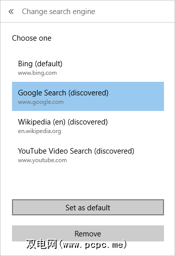 上面的屏幕截图是设置的样子例如在Google,Wikipedia和YouTube上搜索之后。现在,已经发现了这些引擎,您可以将它们设置为Edge搜索的默认引擎。 (或者,也可以根据需要删除它们。)