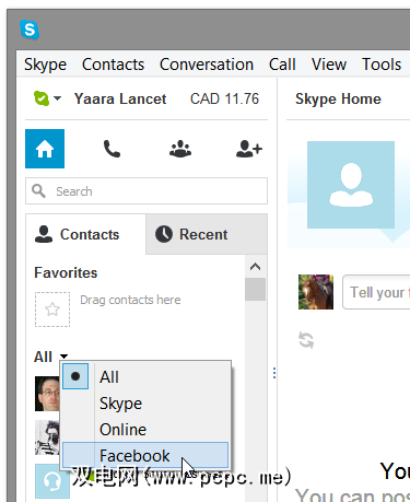 将Facebook添加到您的Skype联系人,请点击“联系人"标签中的“全部"下拉菜单,然后选择“ Facebook "。点击“连接到Facebook ",输入您的Facebook凭据,即可完成设置。现在,您所有的Facebook联系人都可以通过Skype进行访问,与他们聊天的感觉和感觉就像与Skype联系人聊天一样。