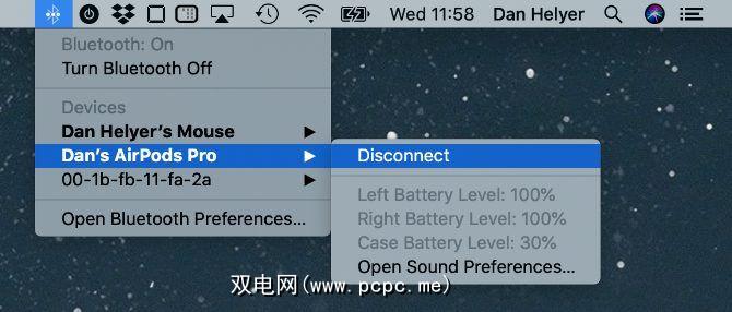 AirPods使用蓝牙与Mac配对,这意味着您需要打开蓝牙菜单以检查电池电量。为此,请单击菜单栏中的蓝牙图标,然后将光标悬停在AirPods上方以显示电池电量百分比。如果您没有看到此图标,请转至系统偏好设置>蓝牙。