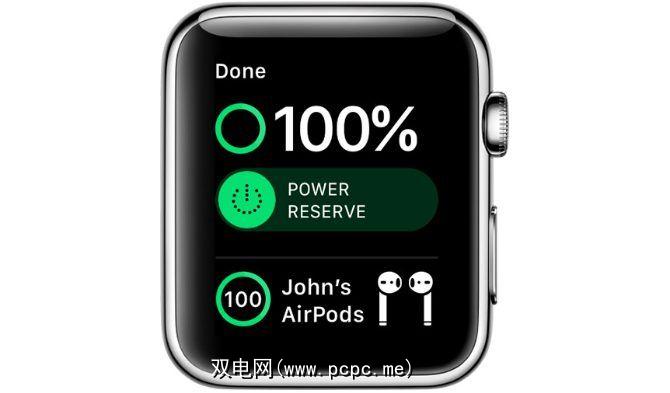 在以下屏幕上,您的Apple Watch会向您显示Apple Watch和已连接的AirPods的电池电量。如果您的AirPods处于打开状态,则还可以从此屏幕上查看充电盒的电池电量。