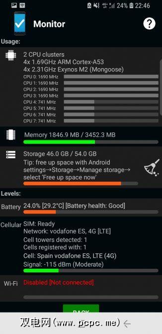 值得庆幸的是,该应用易于使用。 显示器选项提供有关您当前手机状态的基本概述,包括CPU负载,电池电量和总体运行状况以及您当前的网络连接。