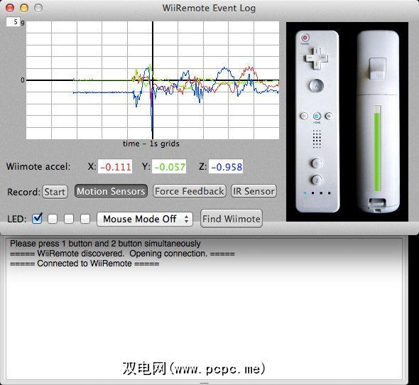 随身携带Wiimote和DarwiinRemote运行,您已经准备就绪,一切就绪。按下DarwiinRemote中的查找Wiimote 按钮,并按住1按钮和2按钮,直到应用程序检测到您的Wiimote。在这一点上,您应该能够看到一些曲线弯曲的线条(这是来自Wiimote加速度传感器的数据)。如果不是,并且您使用的是Mac OS X的最新版本,请参考上面的段落。