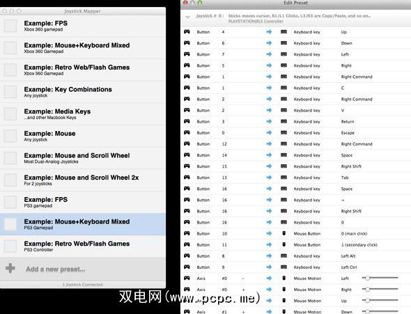 操纵杆映射器使用预设来解释PlayStation 3控制器的信号。选择文件->加载示例将为应用程序填充许多示例预设。这些都是您所需的,因为它们已经包括鼠标,第一人称射击和Flash游戏的预设。您可以通过勾选给定的预设来选中它的左侧复选框。