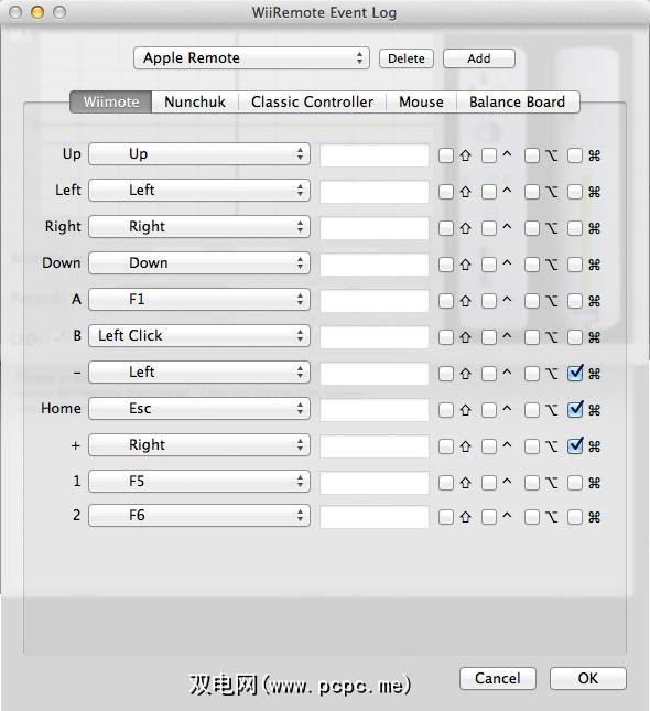 By default, Darwiin Remote is configured for your Wiimote to play well with Front Row. If you want to define other controls, just open the Darwiin Remote preferences. Here you can add and edit existing presets for your Wiimote, Nunchuk, Classic Controller, mouse and Balance Board.