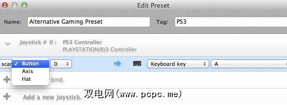 您可以通过编辑示例预设或创建自己的控件来定义自己的控件。这样做非常简单。如果要创建新的预设,则首先必须添加新的操纵杆(您的PlayStation 3控制器)。然后,您可以重新定义或添加新的控件绑定。在左侧指定PlayStation 3控制器的输入键,在右侧指定相关的计算机按钮。
