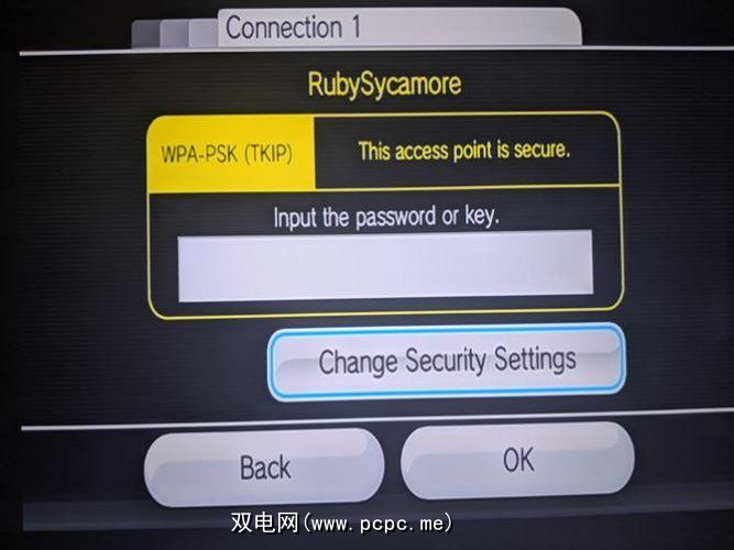 从列表中选择您的网络。接下来,您需要输入您的Wi-Fi密码,以便可以在线获取Wii控制台。此外,请确保左上角的安全类型与路由器的安全类型相同。如果不一致,请选择更改安全设置并选择正确的设置。