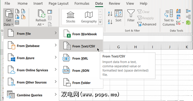 2。转到功能区上的数据标签。然后单击获取数据按钮(在获取并转换数据组中)下的细小的下拉箭头。选择从文件>从文本/CSV。