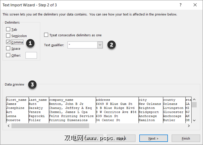 为文件选择分隔符(在我们的示例中为逗号)。对于其他字符,请选中其他,然后在小字段中输入该字符。 数据预览窗口使您可以快速浏览列数据。