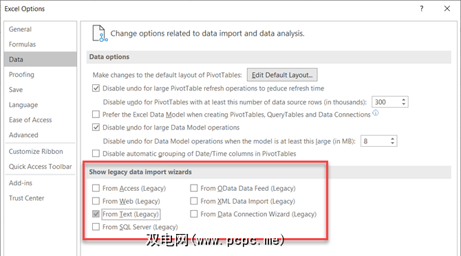 Microsoft在Excel 365和2016(版本1704起)中隐藏了旧的文本导入向导。但是您可以从Excel的选项中恢复文本导入向导。