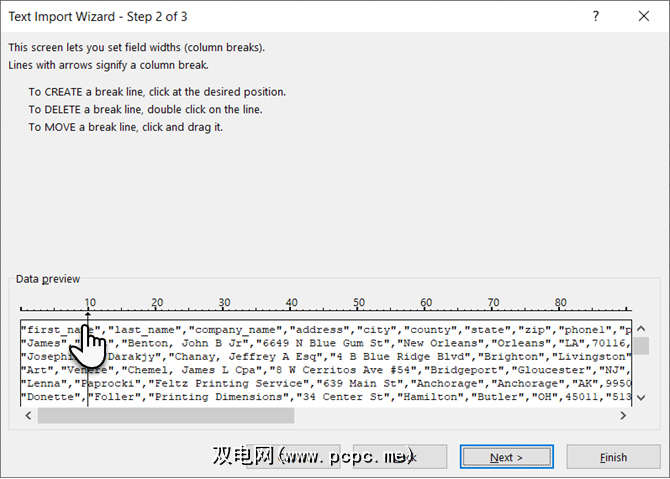 >数据预览窗口可以帮助您设置列宽。使用窗口的顶部栏设置竖线代表的分栏符。拖动分栏符以增加或减小宽度。双击以换行将其删除。