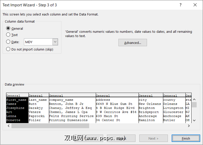 如下所示,Microsoft Excel使您可以完全控制导入过程,并可以使用“预览"窗格在填充单元格之前查看数据的格式。