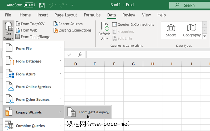 3。要导入文本或CSV文件,请选择来自文本(旧版)。单击确定以关闭选项。