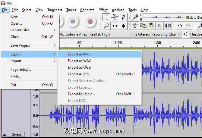 要将WAV文件转换为MP3,请先运行Audacity,然后运行 File> Open 浏览到WAV文件。打开后,检查文件,可能会剪切掉不想要的音频或修剪长度。高兴时,使用菜单命令文件>导出>导出为MP3 开始转换。