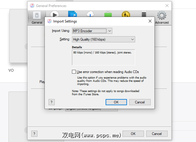 要使用该转换器,您首先需要设置导入设置。在iTunes中,打开编辑>首选项。在常规标签上,找到导入设置,然后将导入使用下拉选项更改为 MP3编码器。调整质量设置以满足您的要求,然后单击确定确认,然后再次退出。