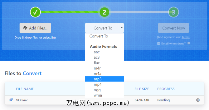 首先访问www.zamzar.com。找到添加文件按钮,然后使用此按钮在PC上浏览WAV文件。或者,在PC上打开相关目录,然后将WAV文件拖到该按钮上。