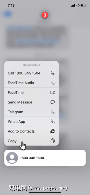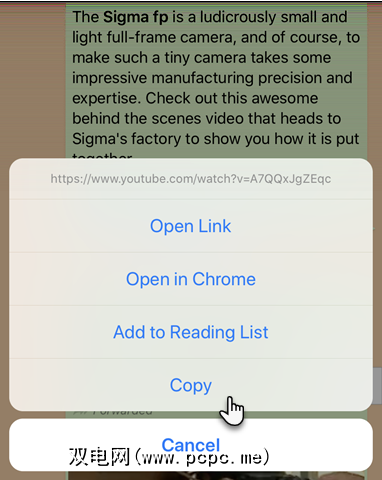 点击并按住链接,直到从屏幕底部出现一个弹出菜单。从此处,点击复制。