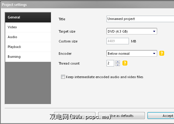 在“项目"设置按钮下,您会找到更多选项微调您的DVD。如果您计划稍后再打开该项目,则可能要给它命名。除非您购买了某些特殊格式的磁盘,否则目标容量可能不会从4.3GB DVD更改。为了简单起见,以我个人的经验为基础,我建议选择4.3GB的DVD-R或DVD-RW,以实现最大的兼容性。在视频下,请确保您的目标视频格式适合您所在的地区。对于美洲,选择NTSC。对于其他任何地方,请选择PAL。最后,在“刻录"下,选中“将项目刻录到光盘"旁边的框。