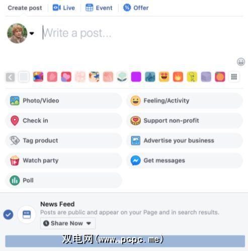 使用< strong>“创建帖子" 框,以向页面添加更新,就像在常规新闻源上一样。您可以创建常规帖子,使用Facebook Live向全世界广播,添加新事件,或为要出售的商品创建特价。
