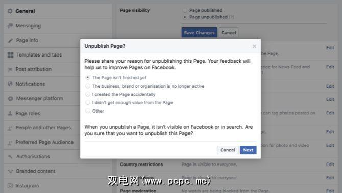 如果页面尚未完成,则可能要取消发布直到它处于更好的状态。为此,请访问页面,单击右上角的设置,然后单击页面可见性。如果您决定取消发布,请别忘了回到这里并在页面完成后再次显示您的页面。