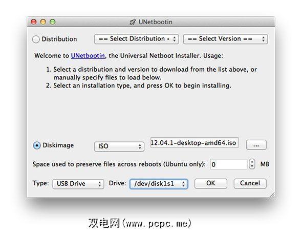 由于我是Mac用户,因此我在主操作系统上下载了Ubuntu .ISO。 X机,然后使用UNetbootin将映像“刻录"到备用的2GB USB记忆棒。该程序通知我该磁盘无法在Mac上引导,如果您使用的是旧Mac作为服务器(虽然不太旧,但Amahi不支持PowerPC架构),请记住这一点。如果需要制作可在Mac上启动的USB驱动器,请查看Ubuntu文档。