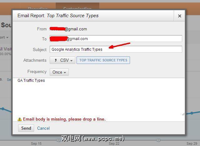 创建自定义报告后,就该安排电子邮件了。将您的数据发送到您的Gmail帐户。为此,请单击“自定义"视图页面顶部的“电子邮件"按钮,然后填写所有字段。请特别注意您的“主题"行,因为这是您将在Gmail中使用的用于识别此传入数据的确切文本。此外,此处的频率显示为“一次",但实际上您实际上希望最终将其设置为“每月",或者无论您希望生成这些自动报告的频率如何。最后,请确保选择“ CSV"格式。