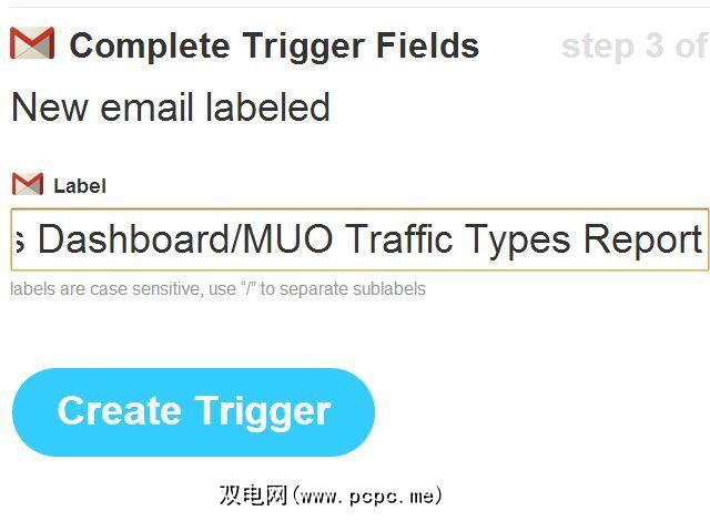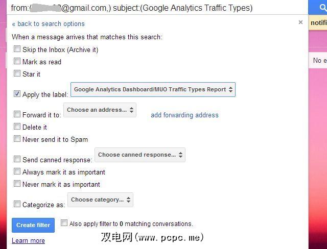 在Gmail中,您要标识带有特定标签的传入数据流。在您的Gmail帐户中,进入设置,然后单击“标签"菜单项。点击“创建新标签"按钮。在此示例中,我在“ Google Analytics(分析)仪表板"文件夹下创建了一个名为“ MUO流量类型报告"的过滤器。最后,创建一个电子邮件过滤器,以查找具有您所创建的主题(本例中为“ Google Analytics(分析)流量类型")的所有传入电子邮件,然后应用您创建的标签。如果您不想让收件箱混乱,请点击“跳过收件箱"。