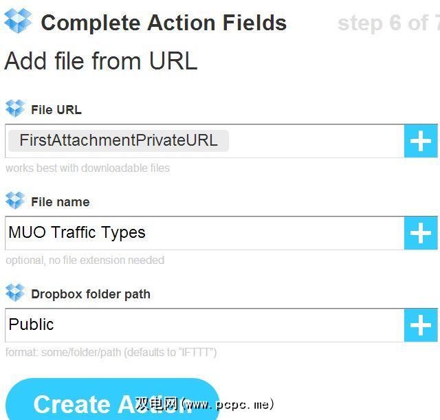 对于食谱的“输出"一侧,选择“ DropBox" ,然后将传入的附件(Google Analytics(分析)CSV文件)放入您可访问的文件夹中的Dropbox帐户中。