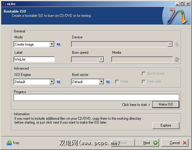 在 Mode 下,选择是否想要创建映像或对光盘执行直接刻录。 Direct Burn可能是更简单的选择,因为nLite会将其直接写入磁盘。做出选择后,点击设置ISO 。如果您决定刻录到图像,请使用您喜欢的图像刻录软件将其写入磁盘。