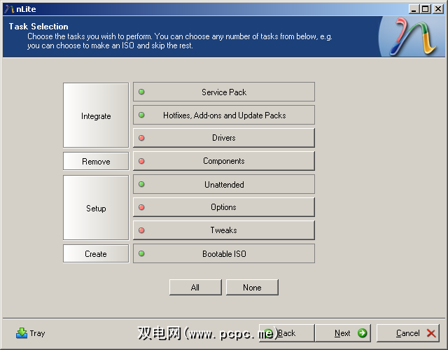 由于这是您首次运行nLite,因此将没有任何预设。只需单击下一步以进入任务选择页面。在任务选择页面上,选择修补程序,加载项和更新包,无人参与和可启动ISO 。如果由于版本较旧而必须下载Service Pack 3,请同时选择 Service Pack 。