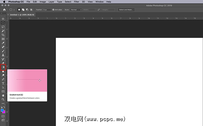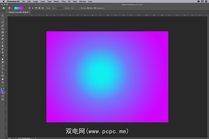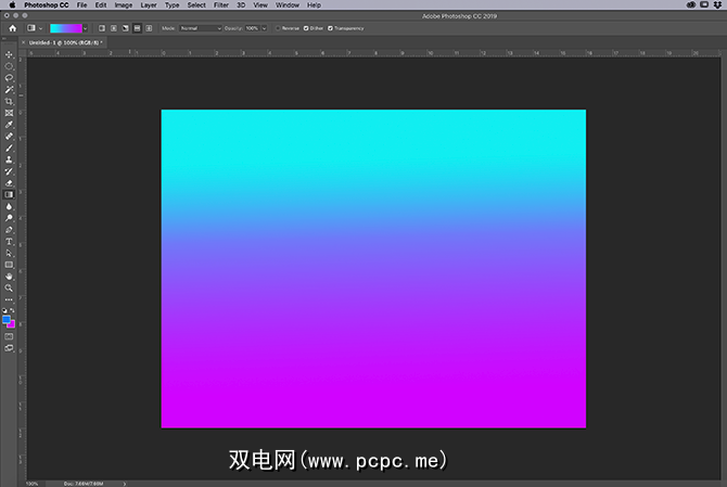 打开画布后,请确保您的渐变工具处于活动状态,此处以红色突出显示。启用后,使用工具栏底部的色标在渐变中选择两种颜色。在本教程中,我们将使用明亮的蓝色和紫色来创建“霓虹"外观。