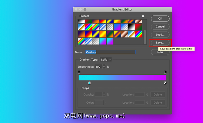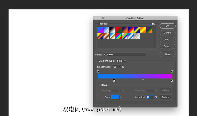 在编辑器顶部,您会看到一行< Photoshop CC随附的strong>预设。编辑器右侧是用于加载,保存和创建新渐变的选项。编辑器的底部是用于自定义渐变的工具。