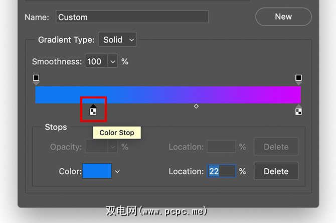 您可以创建两种不同样式的渐变。我们要设计的第一个称为实心渐变。您可以在编辑器中间的下拉菜单中看到 Gradient Type:Solid 的下拉菜单中看到此选项。
