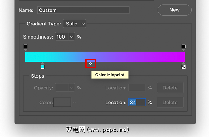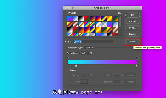 假设您非常喜欢创建的渐变,并且想在其上再次使用它另一张图片。为此,请转到渐变编辑器>新建。这会将新的色板添加到您在预设窗口中创建的渐变中。