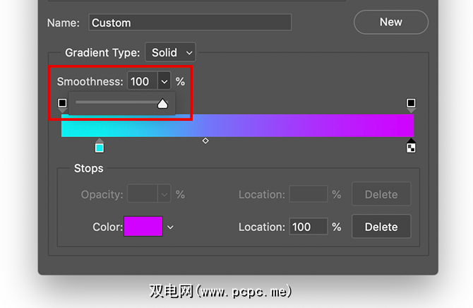 您还可以调整混合的平滑度这些颜色在一起。对于本教程,我将保持100%的平滑度,但是如果您想让``滑块''看起来更滑,请将该滑块拉到较小的百分比。