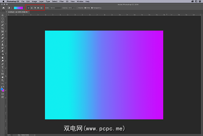 下一步,单击确定 >退出渐变编辑器。然后转到工作区左上角位于颜色栏旁边的渐变样式按钮。您可以使用五种不同的样式,但是它们的工作方式都相同。