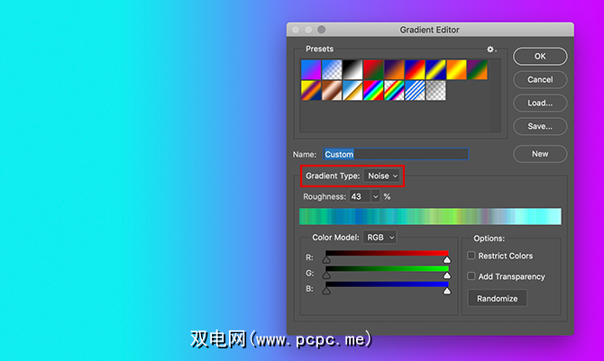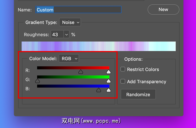 要创建噪声渐变,双击您的颜色栏以访问您的渐变编辑器。在渐变类型旁边,单击下拉菜单以选择噪声。您将立即在编辑器的底部看到一个新的颜色滑块,以及两个用于调整粗糙度和颜色模型的区域。