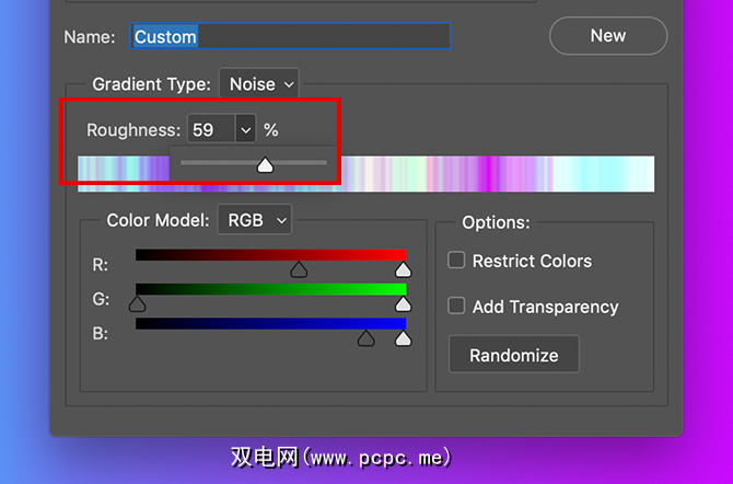 您还可以使用调整这些颜色之间的对比度。 >粗糙度。较高的粗糙度意味着渐变将具有非常明显的颜色线。较低的百分比表示将混合颜色。