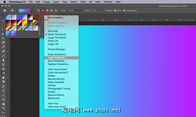 下一步,单击加载渐变。这将显示您的渐变列表,您可以在其中选择自定义色板。选择后,单击确定。