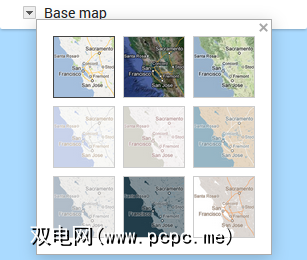下一步,为您的地图选择一个设计。点击基本地图旁边的下拉箭头以查看选项。您可以选择不同的配色方案,也可以选择是否具有卫星图像。只需单击所需的选项,地图就会自动更新。