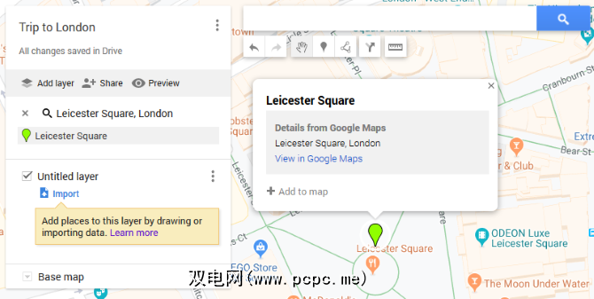 例如,我搜索了“莱斯特广场",因为我想将其钉在地图上。现在它显示在左侧的临时图层中,我可以单击添加到地图以将其永久固定在我的地图上(或者,如果您只是想放大某个地方开始,则不执行任何操作)。