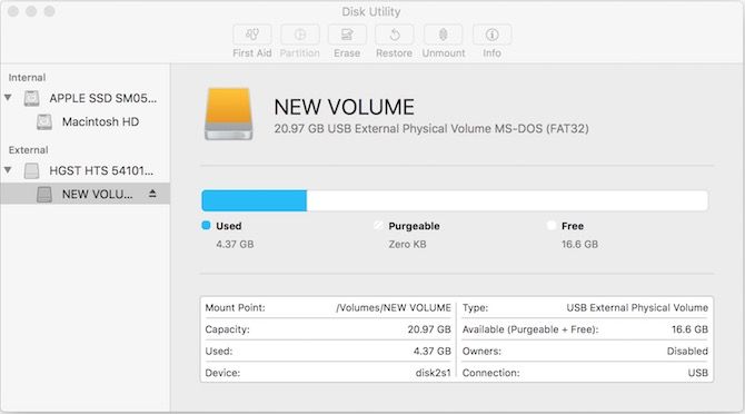 连接外部驱动器(或者,如果您使用的是较旧的Mac,则是 Utilities 文件夹中的i。您的磁盘将出现在左列窗口中。单击一次以突出显示,如下面的屏幕快照所示。<
