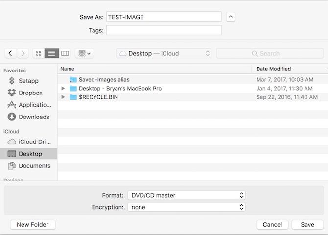 现在您已经选择了光盘映像的来源,请单击文件>新建>磁盘映像来自... 。在弹出窗口中,选择台式机 >作为目的地,接下来,确保选择 DVD / CD Master 作为图像格式。选择此格式可确保磁盘内容完全作为.CDR复制。图像。