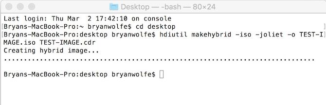 从上面的屏幕截图可以看出,Terminal将创建一个新的混合图像。使用ISO 9660和HFS文件系统的Windows和Mac计算机都可以使用此映像。