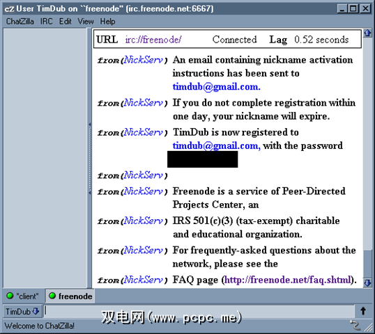 可能会使用您的初始用户名,并且会给您类似“ Tim____"的字样。您可以使用命令“ / nick NickName "(无引号)来更改您的昵称。如果您打算经常使用频道,则不妨使用密码保留所选的昵称。您可以使用“ / msg nickserv注册密码email @ address "格式的命令来执行此操作。稍后返回服务器时,可以使用“ / msg昵称标识密码"登录。