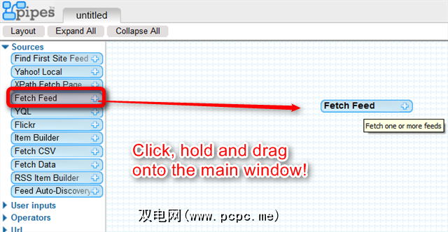Yahoo Pipes界面由一个左窗格组成,包含多个模块和一个主窗口。要创建管道,只需将模块从左侧窗口拖动到右侧主窗口即可。在本教程中,您将使用“获取提要"模块。