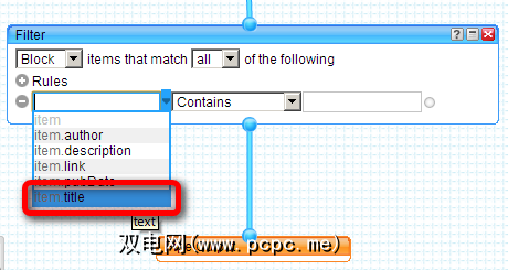 设置关键字后要过滤的字词,请点击“项目"框,然后选择“ item.Title"。您可以选择任何一种,但是任何RSS feed的标题通常都包含您要过滤的最相关的信息。