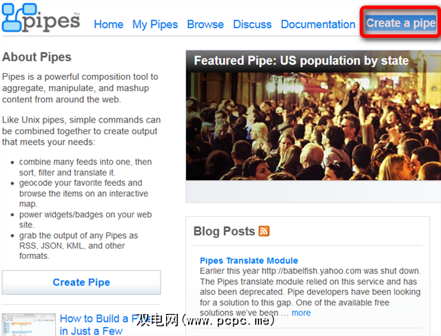 收集供稿后,转到Yahoo Pipes主界面。单击屏幕顶部工具栏中的“创建管道"按钮。