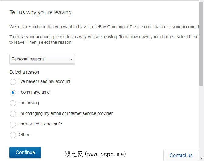 访问eBay关闭帐户页面并根据需要登录。在这里,eBay会询问您关闭帐户的原因。从下拉列表中选择一个类别,例如安全问题或个人原因,然后从项目符号中选择一个特定的原因。