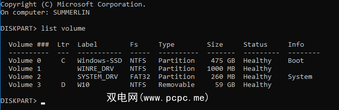 键入 cmd 该字段,然后点击 Enter 。这将打开命令提示符。在这里输入 diskpart 并点击 Enter 以打开相应的工具。在diskpart窗口中,键入列表卷,然后按 Enter 以显示连接到计算机的所有驱动器。